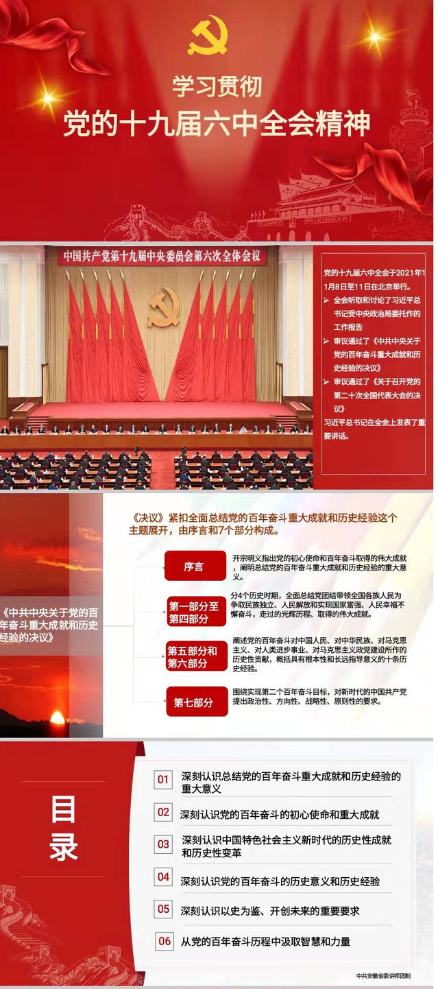 賈峰首先向大家簡要介紹十九屆六中全會和安徽省十一次黨代會的相關會議精神,傳達學習《中共中央關于黨的百年重大成就和歷史經(jīng)驗的決議》和省委黨史學習教育領導小組《關于學習貫徹黨的十九屆六中全會精神深化拓展黨史學習教育的實施意見》的通知,以ppt的形式展示和講解了決議全文、新民主主義革命時期到中國特色社會主義新時代的重大歷史事件,深化了黨員對我黨篳路藍縷、創(chuàng)造輝煌的百年奮斗路的理解。