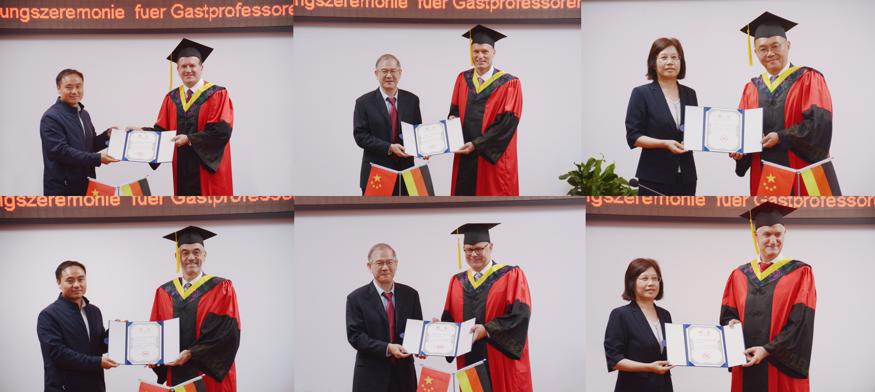 謝超、王其東、吳春梅為葛皖鏑博士等六位客座教授頒發(fā)證書。