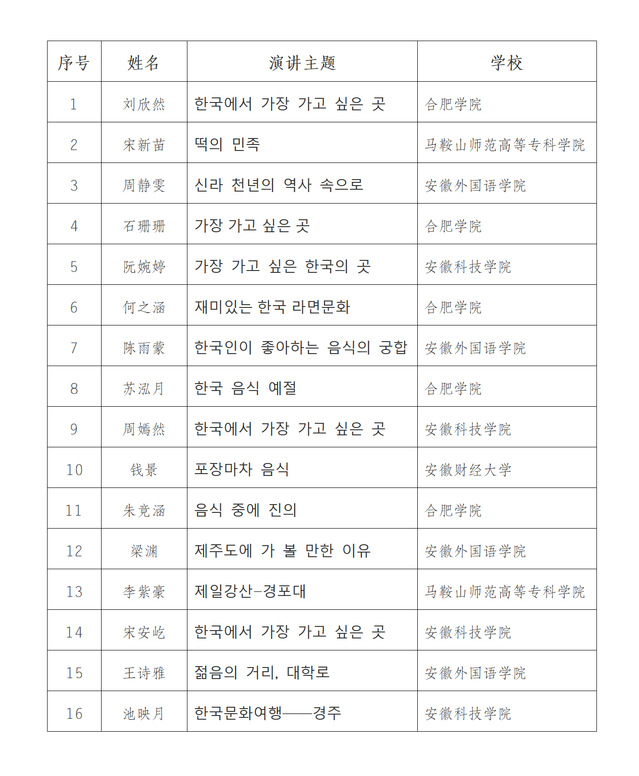 3. 請所有參賽選手填寫第十六屆安徽省順天鄉杯韓國語演講大賽參賽回執(附件1)及參賽選手獎金發放明細表(附件2),并于11月17日(周五)12:00前將表格發送至hexy@hfuu.edu.cn;