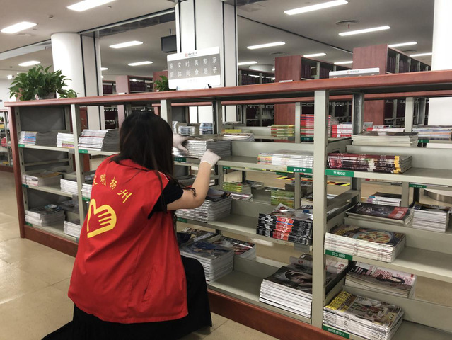 我院隊員蔡劉慧早早地來到了圖書館四樓志愿者簽到處,聽從工作人員的安排并領取志愿工作任務。她的志愿工作地點在期刊部與古籍部,主要工作內容是清理下架逾期較久的雜志、保持雜志報刊整齊擺放、上架最新日期的報刊雜志、整理并排序古籍雜志合訂本、為下架逾期雜志蓋章,志愿時間為一周。看似簡單的工作內容下,實則需要我院隊員付出許多精力去完成工作任務,比如需要忍受因長時間站立而導致的腿腳酸痛、因整理書架的需要而不斷地重復蹲下和起立動作。即便如此,隊員蔡劉慧毫不懈怠,能夠保持著高昂的熱情與耐心較好地完成任務,她的志愿工作得到了工作人員們的認可。