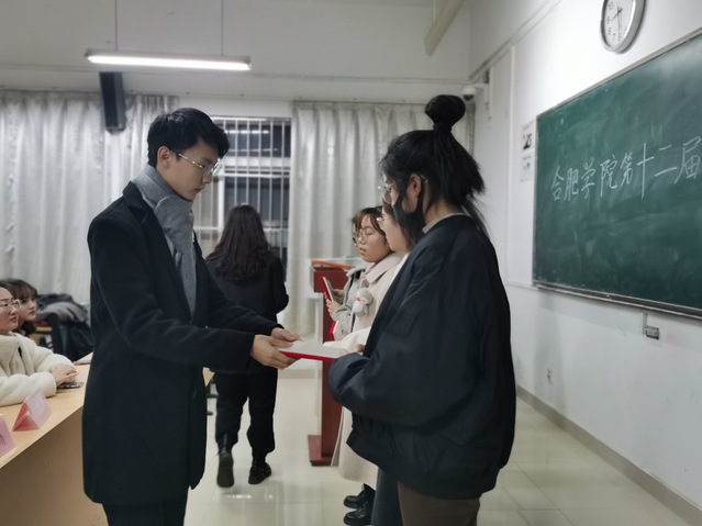 2020年11月28日,合肥學院第十六屆校園文化藝術節之自薦書大賽頒獎儀式于我校一區博學樓B座303教室順利舉行。出席頒獎儀式的嘉賓為經濟與管理學院第二屆學生會主席團全體成員及比賽獲獎者們,儀式由權益部部長羅一主持。