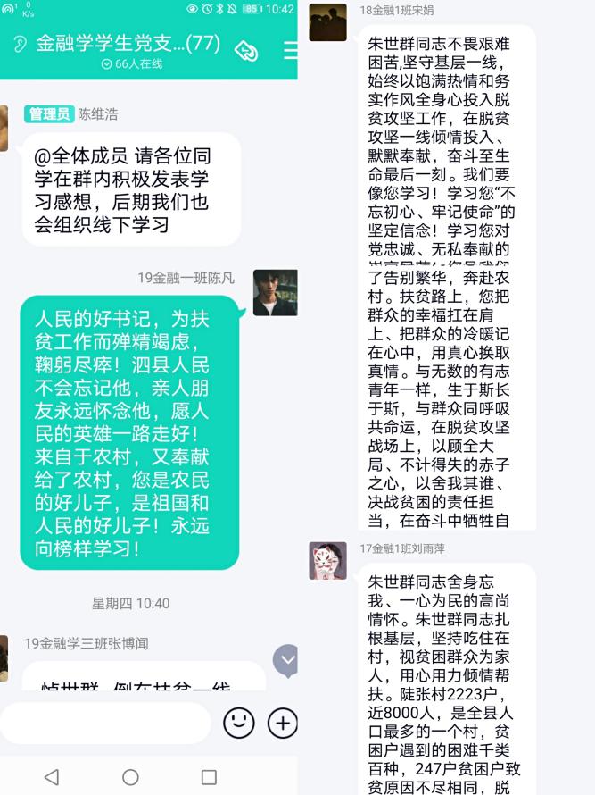 一方面,金融學黨支部黨員們借助互聯網平臺信息傳遞時效快的優勢,在支部QQ群中分享了大量朱世群同志的先進事跡,成員們暢所欲言,深刻表達了對朱世群同志的懷念和敬仰:朱世群同志扎根基層,堅持吃住在村,視貧困群眾為家人,用心用力傾情幫扶。榜樣的力量是強大的,朱世群同志為支部黨員們指引了前進的方向,讓大家向著為人民服務的宗旨、為實現共產主義的最終理想而不懈努力!作為我校的教師榜樣,支部黨員要學習他恪盡職守、真抓實干的務實作風,學習他對黨忠誠、無私奉獻的崇高風范。