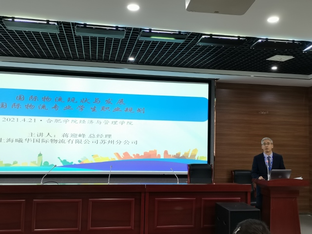 4月21日下午,《國際物流發展國際物流人才職業規劃》講座在一期6幢一樓學術報告廳舉行。上海曦華國際物流有限公司蘇州分公司蔣迎峰總經理受邀擔任主講人,我院副院長吳悅做開場致辭,上海曦華國際物流有限公司合肥分公司部分負責人、我院物流系部分老師和學生參會。