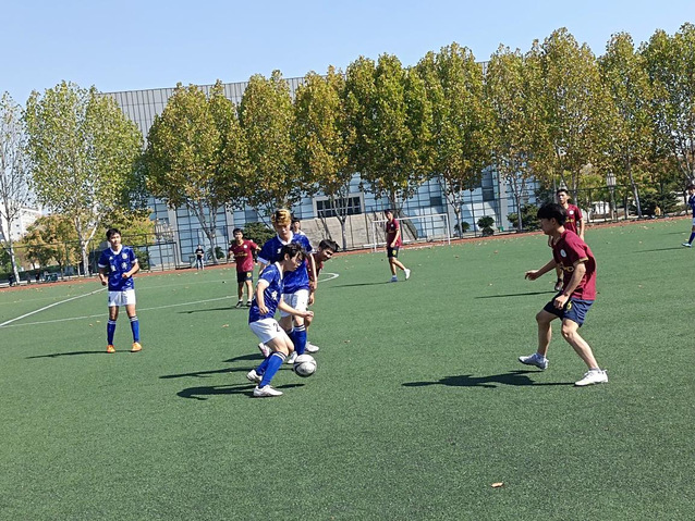 賽前,雙方球員提前到場積極進行熱身,并在操場中央聚集加油打氣。隨著裁判一聲哨響,比賽開始。雙方激烈對抗,周旋博弈,不斷轉換攻守。每一次的華麗轉身和閃躲運球都牽動著觀眾的心。場下觀眾無一不為之吶喊。上半場比賽進入半程,人大隊突然攻勢迅猛,直沖球門,成功拿到比賽第一球。我院隊員立刻調整心態,沉著應對,嚴防死守,人大院幾次進攻被我院隊員成功攔截。一聲哨響,上半場比賽到此結束。經過短暫休息和戰略調整,我院重整旗鼓,兩隊交換場地再次上場。第二場比賽開始,雙方球員鼓足干勁,猛烈進攻。人大院因拿下第一球士氣大增,接連拿下三球。場下,觀眾熱情歡呼,吶喊助威。我院隊員抗下重壓,愈挫愈勇,配合更加默契。球員們奮力攔截對手,接力運球,踢出的足球如流星一般劃出完美弧線,直奔對方球門,最終拿下一分。比賽最后雙方比分1:4,經管隊不幸落敗。