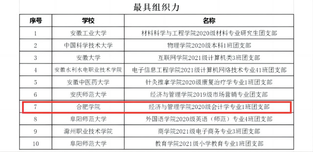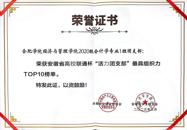 近日,在共青團安徽省委員會、安徽省學生聯合會主辦的2022年安徽省高校聯通杯“活力團支部”“活力社團”風采展示活動中,經濟與管理學院2020級會計學專業1班團支部榮獲安徽省高聯通杯“活力團支部”最具組織力TOP10榜單是我校唯一獲得此榮譽的班級團支部