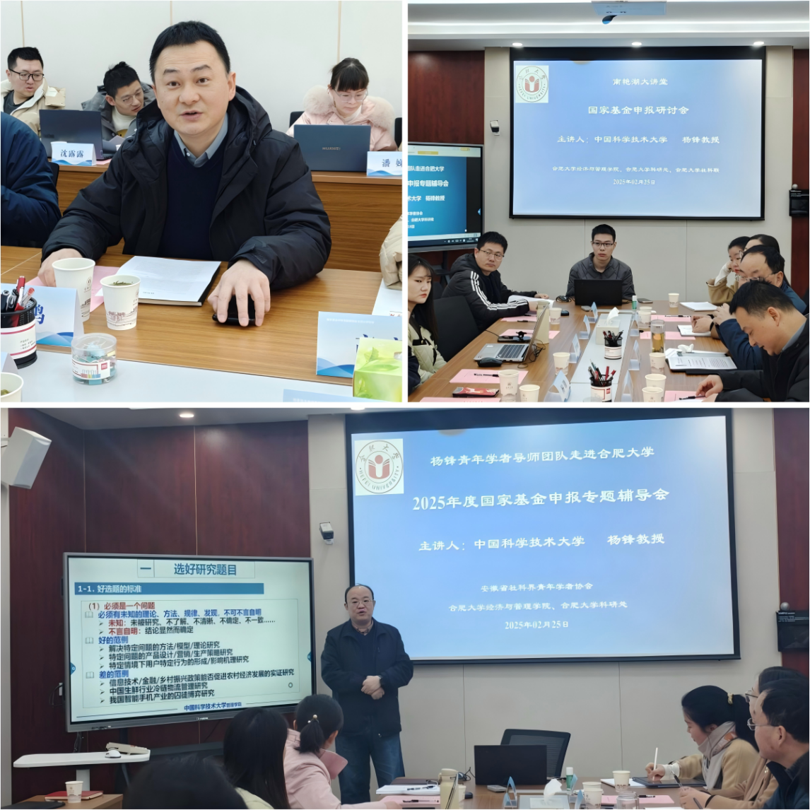 2月25日上午,由安徽省社科界青年學(xué)者協(xié)會主辦,合肥大學(xué)科研處、合肥大學(xué)經(jīng)管學(xué)院承辦的“2025年度國家基金申報(bào)專題輔導(dǎo)會”暨南艷湖大講堂學(xué)術(shù)報(bào)告于一期四棟二樓會議室順利舉行。青年學(xué)者導(dǎo)師團(tuán)隊(duì)中國科學(xué)技術(shù)大學(xué)管理學(xué)院博士生導(dǎo)師楊鋒教授應(yīng)邀作學(xué)術(shù)報(bào)告。安徽省社科界青年學(xué)者協(xié)會執(zhí)行會長、安徽財(cái)經(jīng)大學(xué)科研處處長方鳴致詞,經(jīng)管學(xué)院院長陳江華出席并主持會議,學(xué)校科研處及校內(nèi)外三十多位教師參會。 楊鋒教授針對科研課題選題展開全面且深入論述。他指出,科研選題是科研工作關(guān)鍵起始點(diǎn),優(yōu)質(zhì)選題應(yīng)著眼于未知領(lǐng)域,旨在解決尚未被揭示的理論、方法或規(guī)律等問題,同時要充分結(jié)合研究者自身專業(yè)能力與研究基礎(chǔ),確保具備可行研究條件。楊教授結(jié)合實(shí)際案例,通過正反案例對比,讓教師們清晰認(rèn)識到如何選擇優(yōu)秀研究主題。在申請書撰寫各環(huán)節(jié),楊鋒教授分享了諸多實(shí)用技巧與寶貴建議。 輔導(dǎo)會上,參會青年教師就自己選題與申報(bào)書與楊鋒教授進(jìn)行積極互動,楊鋒教授均予以耐心細(xì)致解答。 此次輔導(dǎo)會內(nèi)容豐富、針對性強(qiáng),為青年教師提供了清晰思路與方法,提升了老師們申報(bào)國家項(xiàng)目的信心。 (科研處、經(jīng)濟(jì)與管理學(xué)院 撰稿:袁玉琪 邸志偉 初審:方鑫 復(fù)審:余宏強(qiáng) 終審:吳悅) |