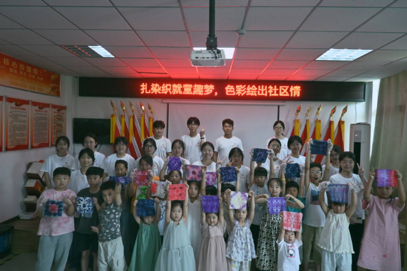 上午,團隊抵達潁陽社區,開展扎染知識講解活動。團隊成員聶雨孜向社區小朋友介紹扎染的歷史、工藝及技巧。實踐環節,團隊成員為每位小朋友發放扎染材料,并指導他們進行扎染制作。小朋友們按照所學方法制作,最終呈現出各具特色的扎染作品。同時,團隊在社區內發布銀發經濟健康知識調查問卷,收集社區老年人的健康需求信息,為后續社區服務提供數據參考。