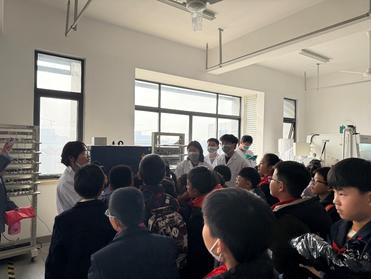 隨后,同學們前往53棟電池實驗室平臺,開啟了一場能源科技的探索之旅。在研究生的帶領下,學生們參觀了各種類型的電池與儀器設備,并了解了新型鋰電池的工作原理。通過老師生動的講解,學生們明白了電池如何通過化學反應儲存和釋放能量,宛如“能量的小倉庫”。這次參觀不僅拓寬了他們的科學視野,還激發了對能源、環保等話題的思考。