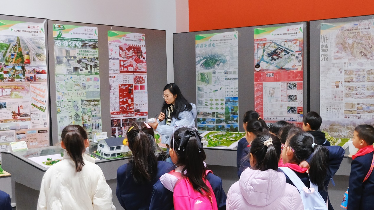隨后,學生們一同步入合肥大學設計學院,開啟了一場富有創意與教育意義的參觀之旅。設計學院的胡明璐老師親自為學生們講解了展廳中各類設計專業的創新成果,涵蓋了環境設計、動畫、視覺傳達等領域的前沿作品。通過對這些作品的深入解析,學生們不僅了解了現代設計如何緊密結合社會需求,還進一步領悟了設計的創新理念與實際應用。參觀激發了同學們對設計學科的濃厚興趣,促使他們思考如何將設計思維與社會責任相結合,以提升個人的文化素養與創新能力,拓寬視野,并激發了他們對學術探索和創意實踐的熱情。