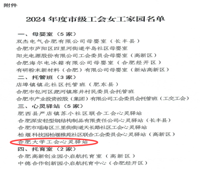近日我院女工家園——“心靈驛站”為主體的合肥大學(xué)工會心靈驛站合肥市工會正式命名為“合肥市示范女工家園”。同時,還獲得了項目資助金,以表彰和支持我院在關(guān)愛女工心理健康、構(gòu)建和諧工作環(huán)境方面的杰出貢獻。