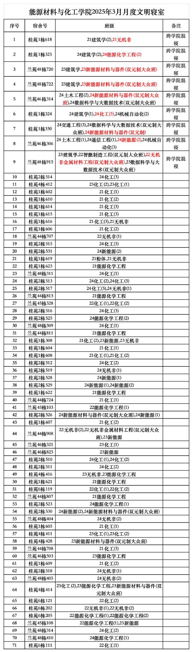 能源材料與化工學院2025年3月學生文明宿舍結果公示