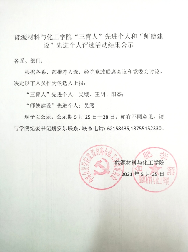 能源材料與化工學院“三育人”先進個人和“師德建設”先進個人評選活動結果公示