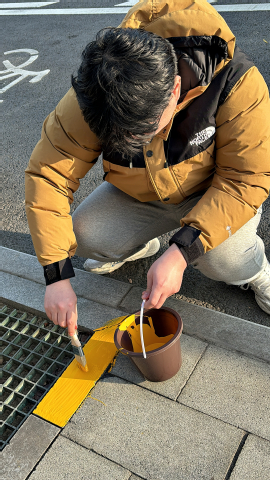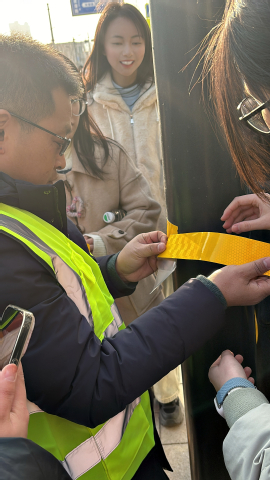 活動最后是動手實踐環節,在技術人員的指導下,學生們動手參與熒光涂料的涂抹及熒光貼張貼。通過實際操作,學生們深刻體會到交通安全設施在夜間警示駕駛員與行人、降低交通事故風險中的重要作用。
