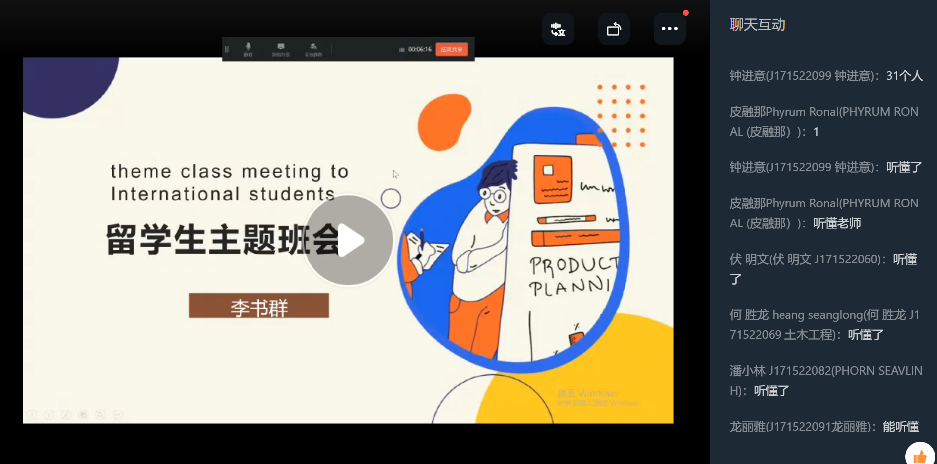 為了進一步加強留學生管理,不斷提高留學生線上上課教學效果,城建學院于4月13日中午13:30對17土木(留學生)、19土木(留學生)、20土木(留學生)及20建筑學(留學生)共計60多人召開了一次關于線上課堂要求的主題班會。班會由李書群老師主持。