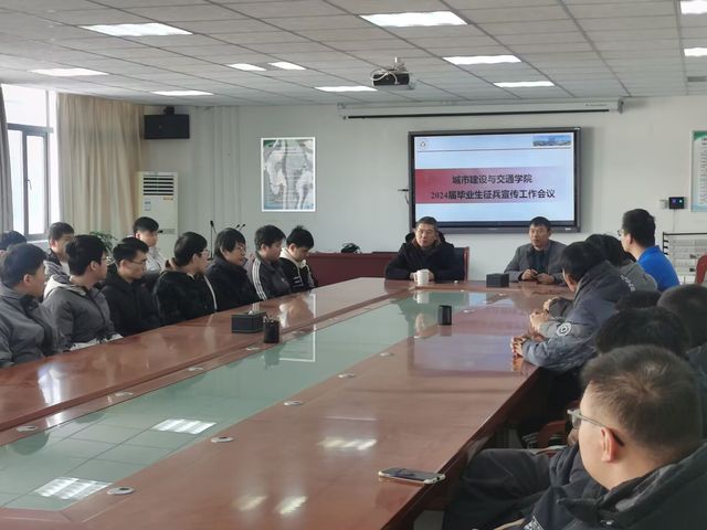 2023年12月1日中午在41棟3樓大會議室,城建學院召開2024屆畢業生征兵宣傳工作會議,城建學院黨委書記張永軍、畢業班輔導員以及畢業班的本科生、研究生參加了會議。張書記在會上把最新的大學生征兵政策向同學們作了詳細的解讀。