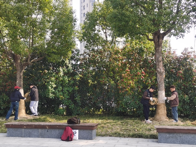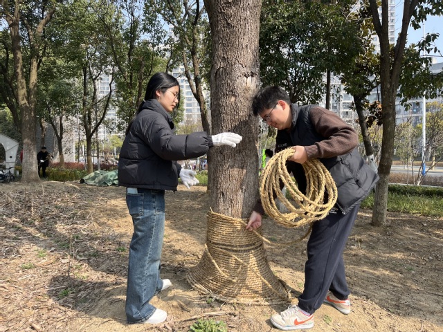 活動伊始,在公園管理處工作人員的安排下,園林工作人員對同學們進行了簡單的培訓,演示大樹“脫衣”過程,講解技巧與細節。學生黨員們積極熱情地投入勞動中,耐心解開防風麻繩,收拾整齊,以便日后回收利用。遇到粗壯的大樹,學生們兩兩配合,經過幾個小時的努力,志愿者們終于完成了所有的任務。
