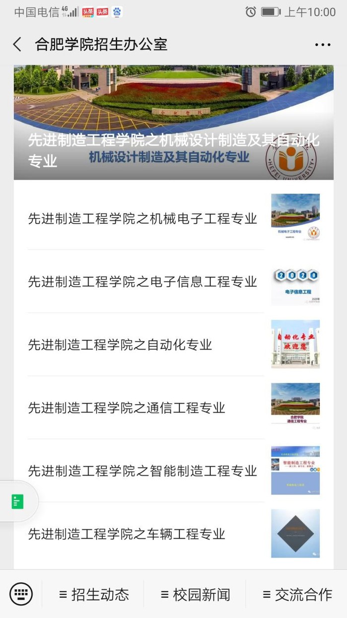 校微信公眾號影響力持續(xù)提升。貫穿學(xué)校近三年辦學(xué)成果,合肥學(xué)院招生辦微信公眾號陸續(xù)發(fā)布學(xué)院簡介和專業(yè)簡介系列主題推送40余篇,全面直觀地介紹了學(xué)院專業(yè)的師資隊伍、學(xué)生活動和教學(xué)科研成果等內(nèi)容,為關(guān)注學(xué)院專業(yè)發(fā)展和有意報考的考生提供了全方位的信息服務(wù)。