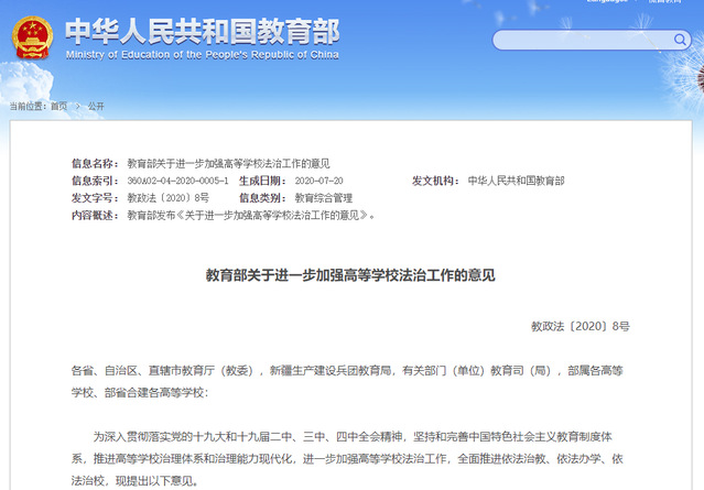 為深入貫徹落實黨的十九大和十九屆二中、三中、四中全會精神,堅持和完善中國特色社會主義教育制度體系,推進高等學校治理體系和治理能力現代化,進一步加強高等學校法治工作,全面推進依法治教、依法辦學、依法治校,現提出以下意見。