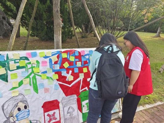世界精神衛生日是每年10月10日,精神衛生是指一種健康狀態,在這種狀態中,每個人都能夠認識到自身潛力,能夠適應正常的生活壓力有效地工作為其居住的社區做出貢獻。本次活動主要分為制作心情顏色畫板、心理趣味小知識便條、心情盲盒、撕掉心情標簽、心情分享和給未來自己的一封信六個部分。活動初期,志愿者主要開展制作心情畫板和分發心理小知識便條兩個活動,用綠色黃色紅色和藍色分別代表開心無聊生氣和憂郁的心情,讓同學們按照當天的心情選擇畫筆的顏色隨意畫在畫板上完成畫作《我的心情日志》,并準備心理趣味小知識便條,讓更多同學了解心理知識。活動的第二天,志愿者們積極鼓勵同學同學們在便簽上寫下自己的煩心事,貼在展板上,隨后在心情盲盒中抽取一張帶有鼓勵或正能量的話語便簽投入盲盒中,讓溫暖傳遞。活動后期,志愿者與同學們一起談心,聊聊自己遇到的難題,幫助同學們一起解決問題。在活動的最后,同學們起筆寫下給未來自己的一封信。