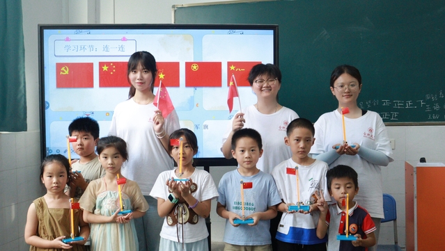7月7日下午,合肥大學教育學院“同筑鄉村夢,共‘育’振興果”志愿服務隊在合肥市小廟鎮蜀山行知學校開展了暑期“三下鄉”社會實踐活動。教師黃秋語給孩子們帶來一堂理論與實踐相結合的愛國主義教育課,讓孩子們認識我國不同種類的旗幟并了解它們背后的故事。 “五星紅旗上,大的黃色五角星象征著黨,四個小的五角星緊緊環繞在大的五角星周圍,象征著人民,寓意人民緊密地團結在黨的周圍。”孩子們坐的端正,聽教師講述國旗、團旗以及隊旗的含義和由來。新中國的成立離不開革命先輩們的艱苦奮斗,每一面鮮紅的旗幟背后都有著無數可歌可泣的故事。一段開國大典現場的視頻帶著孩子們進入往昔的場景,將課堂的氣氛推向高潮,五星紅旗緩緩升至旗桿頂端,視頻中的人們發出陣陣喝彩,孩子們也感到心潮澎湃,不禁激動地鼓起掌來。 升旗儀式是對青少年進行愛國主義教育的重要途徑,為促進理論與實踐相結合,教師與孩子們共同制作國旗升降臺手工模型。孩子們在教師和助教的幫助下,聚精會神地用雙手認真地拼湊著每一個零件,最終完成了一個個承載著孩子們對祖國美好祝愿的國旗升降臺。在恢弘的國歌聲中,“小旗手們”神情肅穆地升起了自己的五星紅旗,注視著它們冉冉升起,自豪感油然而生,愛我中華的種子悄然埋入孩子們的心中。 愛國主義教育有助于增強孩子們的國家認同感和歸屬感,塑造正確的價值觀,為孩子們未來人生道路的選擇指明方向。教師將愛國主義教育與組裝國旗升降臺手工模型相結合,讓愛國主義與實踐精神相結合,讓紅色文化的甘露浸潤孩子們的心田。通過本節課的學習,孩子們深刻地意識到,要時刻銘記自己少先隊員的身份,讓愛黨愛國情懷厚植在日常生活中,落實在具體行動里,做有理想、敢擔當的時代新人。(教育學院撰稿:魯丹妮 初審:張弦樂 復審:王迅 終審:劉良宏) |