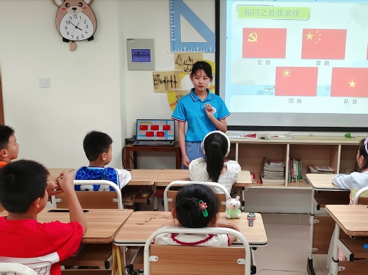 7月9日下午,合肥學院教育學院“七彩童年,‘育’你相伴”志愿團隊前往合肥市包河區濱湖和園社區開展“三下鄉”社會實踐活動。高凡為社區的孩子們帶來一堂生動的愛國主義教育課。本次課程的內容主要是讓孩子們認識一些重要的旗幟,制作國旗升降臺,了解祖國旗幟背后的故事。 “這是五星紅旗,是我們的國旗,是我們心中偉大的旗幟……”同學們坐得端端正正,聽老師娓娓道來黨旗、國旗的含義和由來。新中國的成立離不開革命先輩們的浴血犧牲,每一面鮮紅旗幟的背后正蘊含著這些無數可歌可泣的故事。緊接著,一段開國大典的現場視頻帶著孩子們進入往昔的場景,雖然畫質模糊,但當時現場的隆重與莊嚴的氛圍深深吸引了孩子的目光。當五星紅旗順著旗桿緩緩升到天安門上空,在場的人們發出陣陣喝彩,同學們見狀也心潮澎湃,激動地鼓起掌來。 升旗儀式是對青少年進行愛國主義和國防教育的重要方式,每次升國旗不僅僅是一個形式,更是一次對精神的振奮,對心靈的洗禮。相信孩子們都渴望有一天可以親手將國旗升起。所以當志愿者將升旗臺材料分發給孩子們后,他們都迫不及待地想要立刻拆開材料包,親手制作國旗升降臺。孩子們低著頭,一雙雙小手認真地搭建著。遇到難度較大的步驟時,孩子們也不輕言放棄,在志愿者的幫助下最終完成了制作。一個個國旗升降臺承載著孩子們對祖國的美好祝福。“這是我搭建的國旗升降臺,我很喜歡,我們每個人都要愛護國旗。”其中一個小朋友說道。愛黨、愛國的種子在心里不知不覺地扎根發芽。孩子們緩緩升起了自己制作的五星紅旗,自豪感油然而生。 國旗升降臺的制作,讓愛國與科學相結合;讓紅色文化之花在孩子們心田盛放;讓學生更加清晰地認識到他們作為少先隊員肩負的歷史責任和神圣使命。光是停留在思想上還是不夠的,孩子們需要內化于心、外化于行,時刻銘記自己少先隊員的身份,在日常生活學習中用行動來踐行“祖國旗幟在我心”,把愛黨愛國情懷化為具體行動,立志為實現中華民族的偉大復興而努力奮斗。(撰稿人:彭啟月,審核人:張弦樂) |