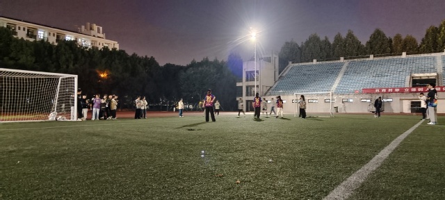 賽前,教育學院的隊伍早早來到比賽場地進行賽前的熱身和準備活動,她們有條不紊地進行賽前的訓練,明亮的燈光打在她們的身上,懷揣理想的她們在此刻似乎在熠熠生輝。比賽正式開始時,雙方隊員迅速站位。隨著裁判員一聲哨響,比賽拉開帷幕,比賽過程中雙方展現了她們一往無前的精神意志以及熟練的技巧,伴隨著田徑場附屬樓內傳來的陣陣鼓聲,教育學院女足的11號隊員梅怡賢以矯健的身姿帶球過人率先拿下1分。雙方隊員你來我往,在足球場上不停地穿梭,她們的身影就是一道亮麗的風景。教院的后衛以及守門員以嚴密的配合牢牢守住了球門。中場休息時,雙方進行了戰術調整及人員的更換。第二場開始后,雙方隊伍不停地進攻,試探,比賽愈發激烈,逐漸進入了白熱化的階段。場外的觀眾時不時爆發出一聲聲的贊嘆,教院的隊伍多次踢中對方的球門,而人大院的隊伍也一次次地逼近教院的球門,整場比賽極具觀賞性。最后以裁判的哨聲落幕,比賽以教育學院女足以1:0戰勝了人大院女足。