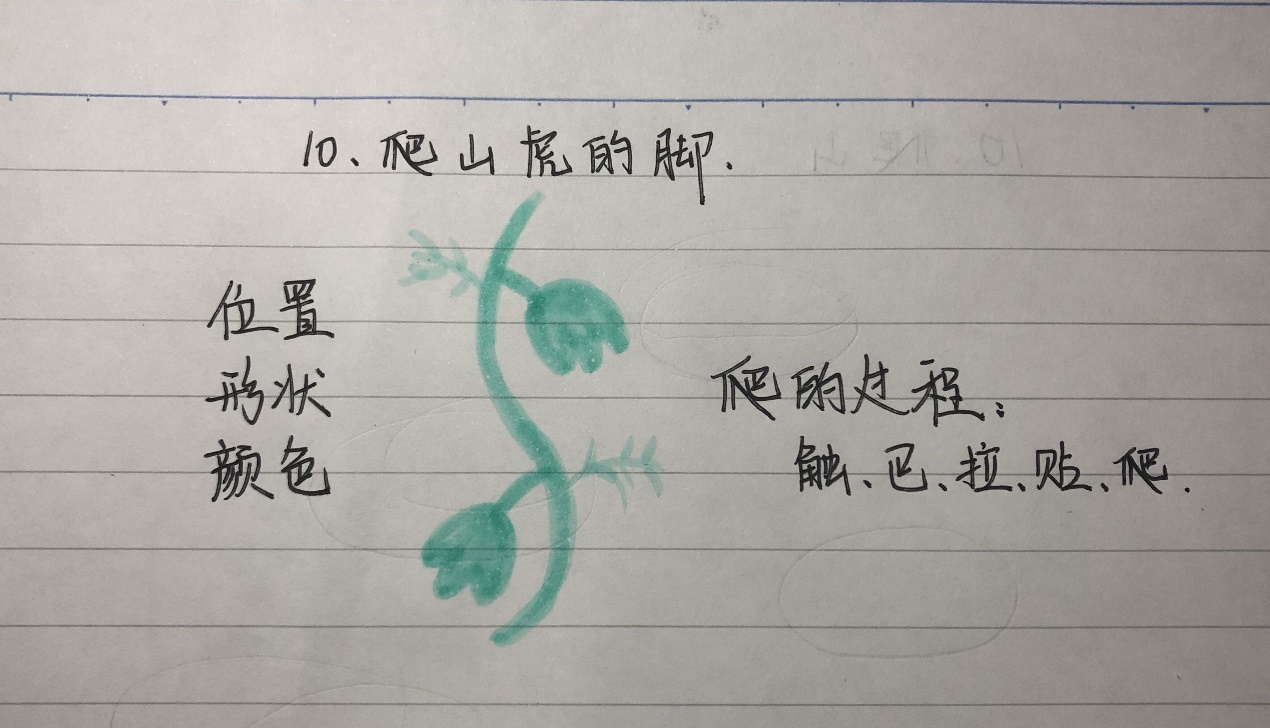 師小結:原來爬山虎可不像動物那樣幾只腳交替著爬,而是長一只腳巴住墻,再爬就必須再長一只腳,再巴住墻。一直往上長,必須不斷長出新腳。所以,葉圣陶爺爺才說爬山虎是“一腳一腳”往上爬。