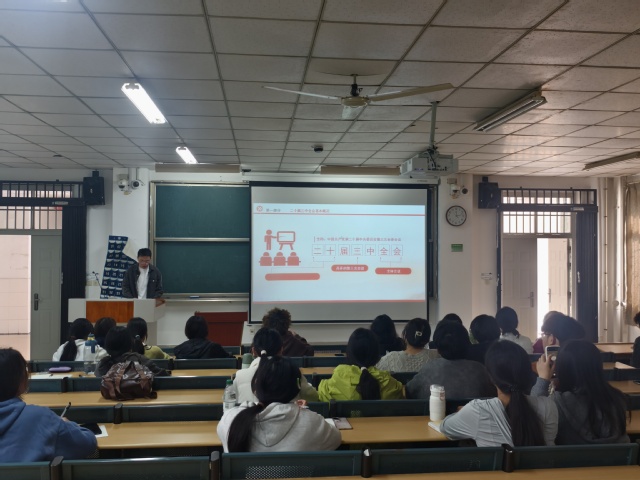 11月14日,合肥大學旅游與會展學院第一期青年馬克思主義者培訓工程第二課于一區博學樓一樓107多媒體教室順利開講。本次課程由合肥大學學習宣傳貫徹黨的二十屆三中全會精神宣講團成員、合肥大學校學生會主席唐宇飛主講、院學生會組織部闞欣悅主持、全體青馬班學員參與學習。