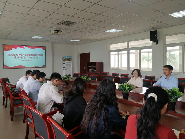5月6日,旅游與會展學院召開深入貫徹中央八項規定精神學習教育新進教職工座談會。學院黨委書記黃雄英,黨委副書記孫靜宇出席。學院近兩年新進教職工參加會議,孫靜宇主持會議。