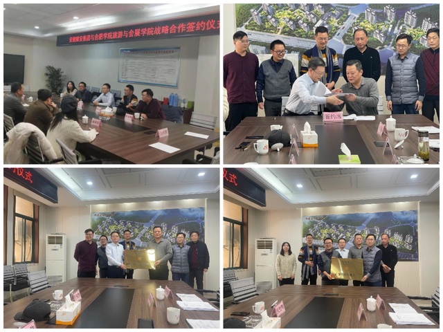 簽約儀式由耀安集團副總經理唐新偉主持,耀安集團董事長姚應凌首先致辭,他高度肯定我校旅游與會展學院在旅游規劃與咨詢中的專業性,希望能夠通過雙方的產學研合作促進安徽耀安集團及其下屬安徽金鳳旅游開發公司的戰略發展,立足銅陵走向全國。劉力院長進行了主旨發言,概括了我院40年波瀾壯闊的發展史,通過我院旅游規劃與咨詢所推進產學研合作,體現出學院應用型、服務地方發展的特點,學院也將以此次簽約為契機,繼續推動教師為地方發展貢獻智慧,提高應用型人才培養力度,為行業及區域的創新發展貢獻更加堅實的力量。隨后雙方在熱烈與友好的氣氛下簽訂并交換了產學研項目合作書,隨后院長劉力、會展經濟與管理系主任王汝幸分別向耀安集團、金鳳旅游公司授牌。