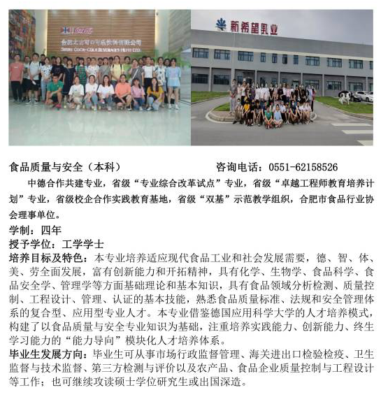 中德合作共建專業,省級一流本科專業建設點,省級“專業綜合改革”試點專業,省級校企合作實踐教育基地,安徽省農產品加工體系果蔬加工崗位依托單位,合肥小漿果加工綜合試驗站,校級重點建設學科