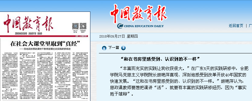 為深入學習貫徹習近平新時代中國特色社會主義思想和黨的十九大精神,深入貫徹落實習近平總書記在北京大學師生座談會上重要講話以及考察北京大學馬克思主義學院時的重要指示精神,深入貫徹落實全國高校思想政治工作會議和中共中央、國務院關于加強和改進新形勢下高校思想政治工作的意見精神,繼續打好提高高校思政課質量和水平的攻堅戰,扎實開展2018年高校思政課教師隊伍建設專項工作,使廣大思政課教師牢固樹立“四個意識”,堅定“四個自信”,中央宣傳部、教育部于2018年7—8月組織高校思政課骨干教師分別赴遼寧、黑龍江、上海、福建、河南、江西、廣東、陜西等地進行實踐研修。7月15日—21日馬克思主義學院院長胡艷萍赴廣東參加了2018年暑期高校思政課骨干教師社會實踐研修班。本次培訓有來自全國的80位教師參加。 實踐研修開設“習近平新時代中國特色社會主義思想在廣東的實踐”“粵港澳大灣區建設現狀與展望”“新時代進一步增強‘四個自信’的理論思考”等專題講座,到廣州珠江新城CBD、東莞松山湖高科技產業園區、中科院云計算中心、亨通光電股份有限公司、港珠澳大橋建設現場、橫琴島開發區、深圳蓮花山、深圳證券交易所、珠三角工匠精神展示館等地實踐研修。 一周的時間,理論學習和實踐研修并重,所聽所見深化了對當前世情、國情、黨情的認識和對黨的創新理論的理解,深入了解了習近平新時代中國特色社會主義思想在改革開放最前沿的生動實踐,對傳承弘揚中華優秀傳統文化和革命文化、社會主義先進文化,全面推動習近平新時代中國特色社會主義思想進教材、進課堂、進頭腦都起到了積極地推動作用,在與各兄弟院校的交流中也收獲了富有啟發的經驗和做法。 中國教育報2018年9月27日《在社會大課堂里取到“真經”——各地高校思政課骨干教師暑期社會實踐研修綜述》中,記述了胡艷萍的感受:“豐富而充實的實踐讓我收獲很大。”在廣東5天的實踐研修中,合肥學院馬克思主義學院院長胡艷萍直觀、深刻地感受到改革開放40年國家的快速發展。“這和在書房里感受到的、認識到的不一樣。”胡艷萍認為,思政課教師要想把課講“活”,就要有豐富的實踐研修經歷,因為“事實勝于雄辯”。(馬克思主義學院) |