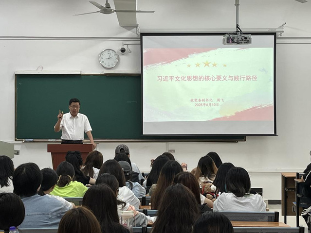 周飛從什么是文化開講,介紹了文化的概念多樣性以及文化分類,進而闡釋了文化的價值以及與文明的關系,重點講了習近平文化思想的生成邏輯、科學內涵以及踐行路徑。周飛指出,習近平文化思想是新時代黨領導文化建設實踐經驗的理論總結,是堅持兩個結合、推進馬克思主義文化理論創新發展的重大成果,標志著黨對社會主義文化建設規律的認識達到新高度。其生成邏輯源于對馬克思主義文化理論的繼承與發展,立足于中華優秀傳統文化的深厚土壤,緊扣新時代中國特色社會主義建設的偉大實踐,回應了時代發展的需求和人民的精神文化期待周飛還通過列舉習近平總書記考察歷史文化場館、強調文化傳承發展的重要講話等實例,生動展現了習近平文化思想在實踐中的孕育與升華結合學校文化建設實際與學生生活,提出要深學細悟習近平文化思想,融入校園文化建設、課堂教學以及社會實踐中,鼓勵同學們堅定文化自信,積極參與文化傳承與創新活動,從中華優秀傳統文化、革命文化和社會主義先進文化中汲取養分,在日常學習生活中弘揚社會主義核心價值觀,以實際行動傳播中國文化,講好中國故事