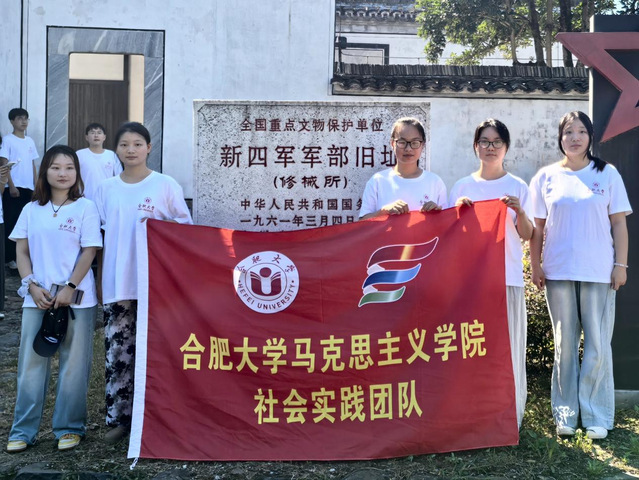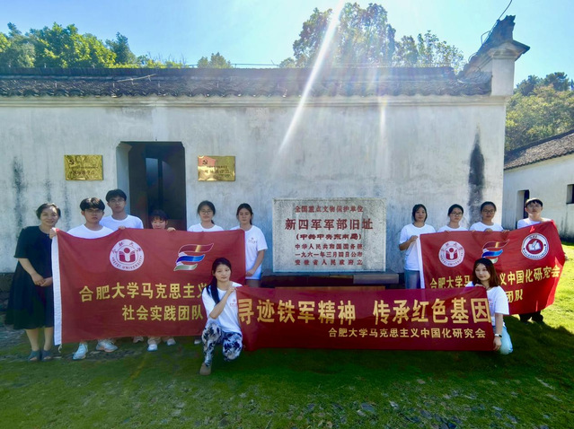 圖為合肥大學馬克思主義學院“星火銘魂,赤韻流芳”小隊于新四軍軍部舊址修械所前合影