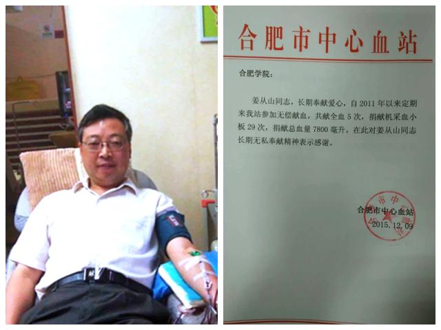姜從山曾榮獲20142015年度“無償獻血貢獻金獎”,該獎是以兩年為限,獻血小板達40個治療量以上,方有資格獲得。目前,姜從山已經是合肥市注冊志愿者,每年至少志愿服務30小時。姜老師還經常利用雙休日赴合肥南站、大學城獻血屋等地進行志愿服務。合肥市中心血站曾經給姜老師寄了一封感謝信,感謝姜老師這些年的無償獻血。