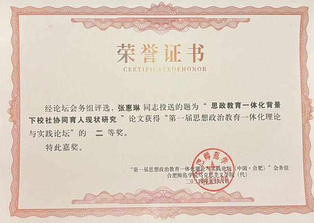 我院教師在大中小學思想政治教育一體化論壇上獲獎 1月6日,第一屆“大中小學思想政治教育一體化”理論與實踐論壇在合肥舉行。我院教師張惠琳博士受邀參會,所提交論文榮獲二等獎。 論壇由合肥市教育局和合肥師范學院聯合主辦,合肥教育科學研究院和合肥師范學院馬克思主義學院承辦,共收到包括中國農業大學、南京大學、南京師范大學、華中師范大學、四川師范大學、海南大學、合肥工業大學、安徽大學、合肥大學等全國各高校教師300多篇參會論文。 張惠琳博士受邀在青年學者論壇上做報告,其撰寫的論文《思政教育一體化背景下校社協同育人現狀研究》聚焦家校社中“學校”和“社會”兩個主體,通過實證研究,著重分析大中小學思政教育一體化背景下校社協同育人的現狀并提出改進路徑。經論壇會務組專家評選,該論文從300多篇投稿論文中脫穎而出,獲得二等獎。 黨的二十大以來,我院積極貫徹落實“用社會主義核心價值觀鑄魂育人,完善思想政治工作體系,推進大中小學思想政治教育一體化建設”的要求,努力推進思政課程改革,探索思政課程與課程思政協同發力,力求實現立德樹人的根本任務。下一階段,學院將進一步加強統籌指導、有效集成資源平臺、在優化師資力量等方面下功夫,努力營造更加良好的思想政治教育環境。(張惠琳/文圖 蘇冰/審核 武奎/編發) |