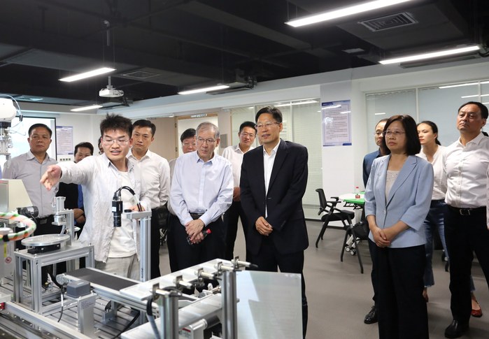 會前,劉玉杰一行先后參觀了大眾學院智能制造產教融合實踐中心、多模態工業設備狀態監測實驗室及中德合作成果展廳等,詳細了解學校學科建設、人才培養、學生就業等情況。