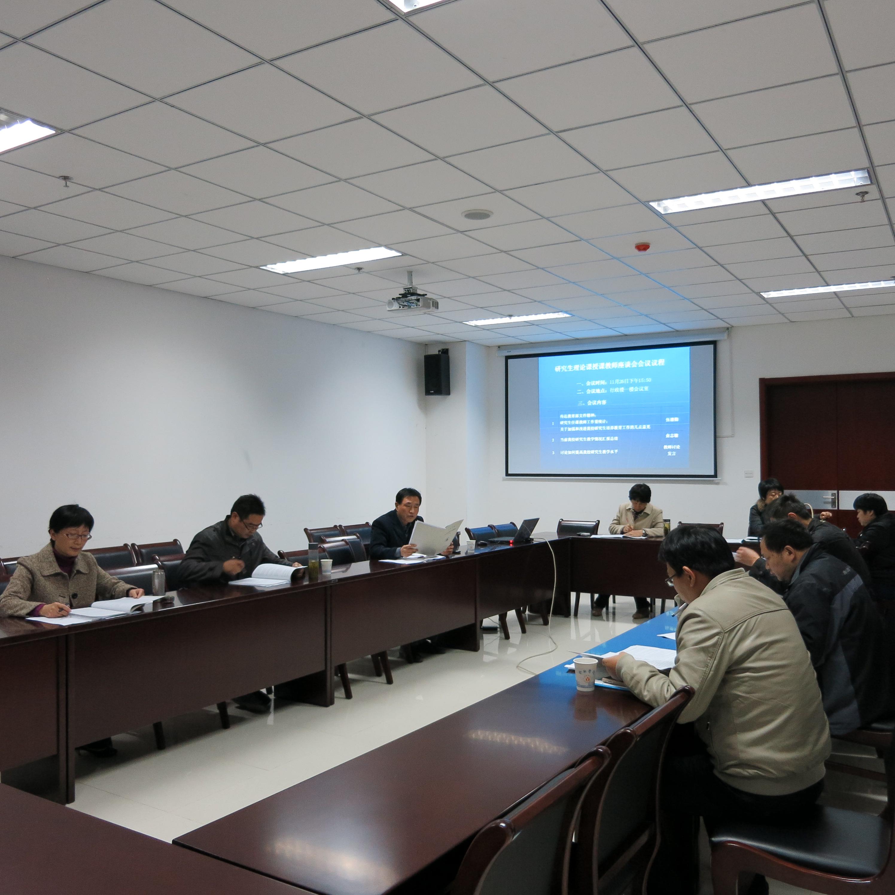 2013年11月26日下午我校在行政樓一樓會議室召開研究生理論課授課教師座談會,主要內(nèi)容有四項:1.傳達教育部有關(guān)研究生教育的文件精神;2.匯報研究生課程課堂教學(xué)檢查情況;3.學(xué)習(xí)我校研究生教育改革方案和有關(guān)管理文件;4.研討研究生理論課程課堂教學(xué)問題。