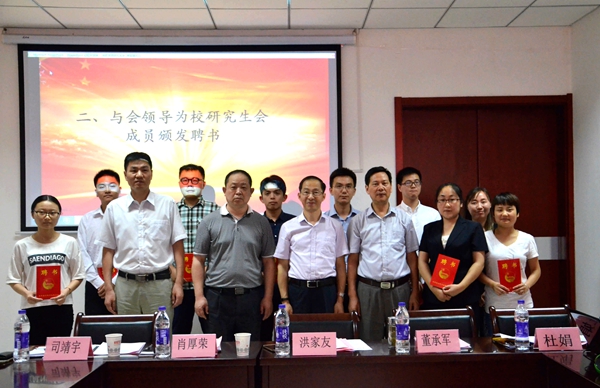 會上,司靖宇宣讀了首屆研究生會成員名單,對當選首屆研究生會的成員們表示祝賀。洪家友為首屆研究生會主席丁海濤頒發了聘書,董承軍、肖厚榮分別為研究生會副主席和各部門部長等主要成員頒發了聘書。丁海濤作為研究生會成員發言,對今后研究生會的發展、如何搭建好研究生會與學校、師生之間的橋梁,積極協助學校做好研究生的管理工作,開展豐富多彩的校園文化活動和科研創新工作等方面談了自己的想法。