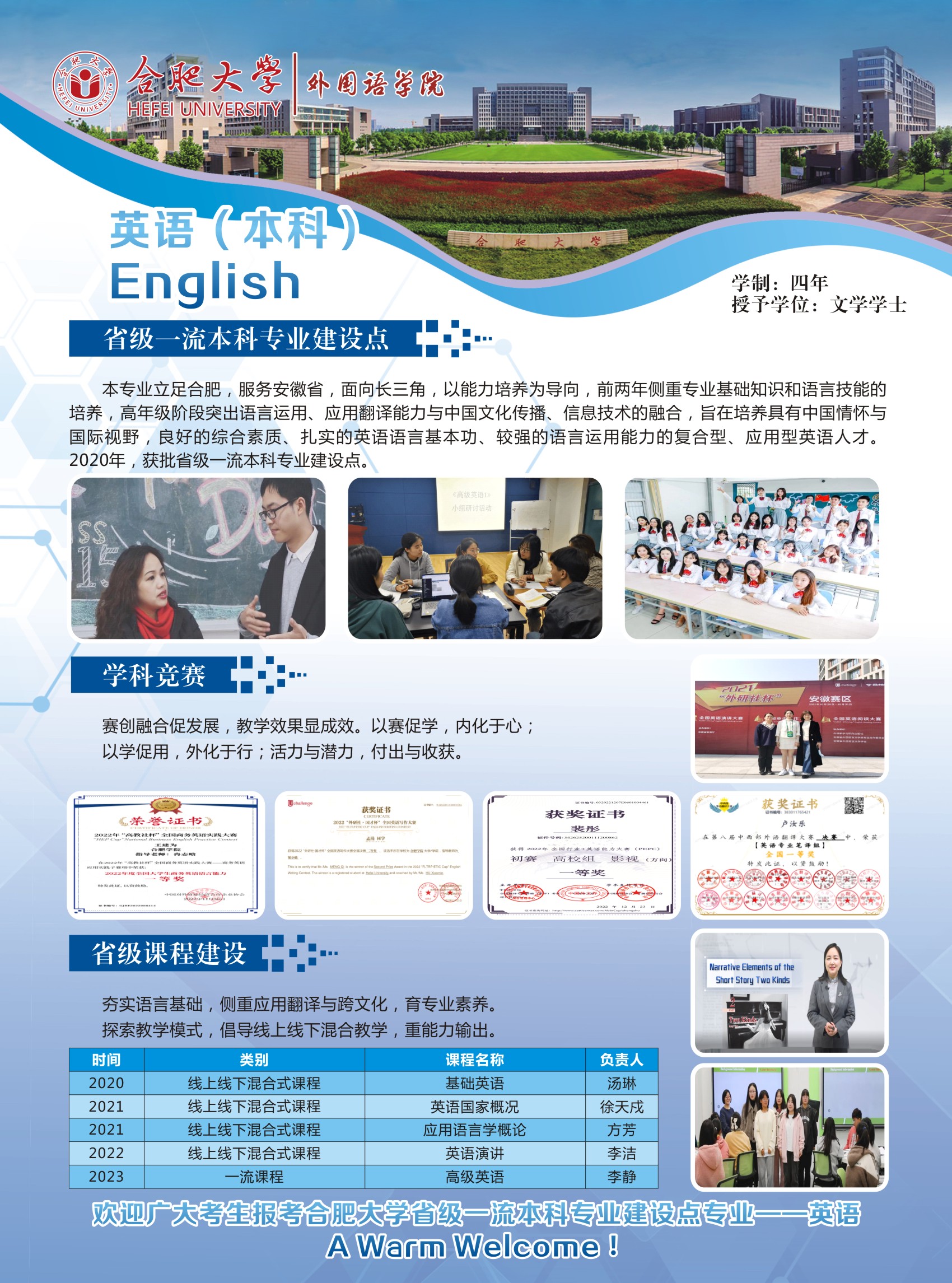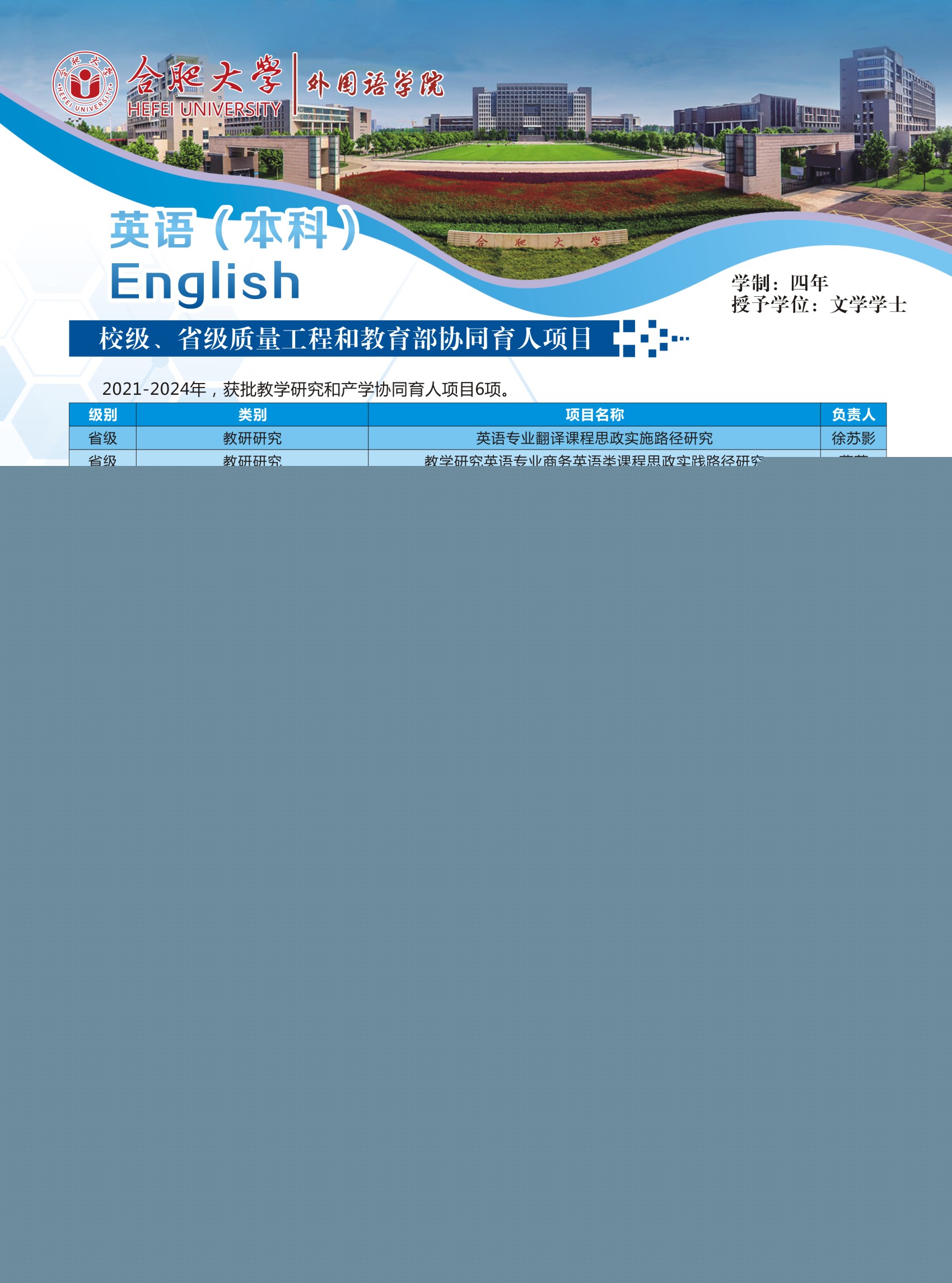 培養目標及特色:本專業培養德、智、體、美、勞全面發展,具有良好的綜合素質、扎實的英語語言基本功、較強的語言運用能力和應用翻譯能力、厚實的英語專業知識和必要的英語教育或商務英語專業知識與技能,能適應安徽、合肥與環巢湖地區區域經濟一體化發展和對外宣傳需要,熟練使用英語從事涉外行業、語言服務行業和英語教育教學等項目管理、應用翻譯、教學等相關工作的具有較高跨文化傳播能力的復合型、應用型英語人才。本專業注重自主學習平臺建設打造分層次的集中實踐和課內實踐教學體系,開拓應用能力培養的課內外輸出路徑,提升了學生講述中國故事、安徽和合肥外宣話語的寫作、演講、翻譯和闡釋能力。