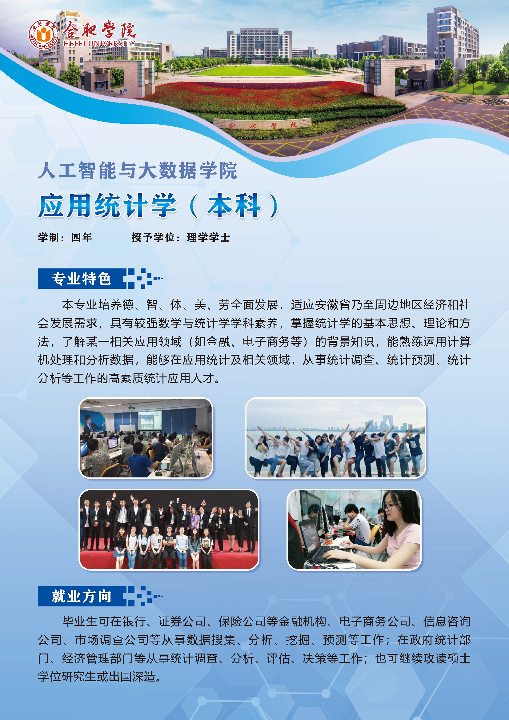 畢業生發展方向:畢業生可在銀行、證券公司、保險公司等金融機構、電子商務公司、信息咨詢公司、市場調查公司等從事數據搜集、分析、挖掘、預測等工作;在政府統計部門、經濟管理部門等從事統計調查、分析、評估、決策等工作也可繼續攻讀碩士學位研究生或出國深造。