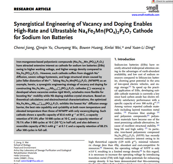 近日,我校生物食品與環境學院2022級資源與環境專業研究生蔣晨熙以第一作者在國際學術期刊《Small Methods》(IF=10.7,中科院二區)發表了題為“Synergistical Engineering of Vacancy and Doping Enables High-Rate and Ultrastable Na4Fe2Mn(PO4)2P2O7 Cathode for Sodium Ion Batteries”的研究論文。我校高級實驗師衛新來、湖南大學教授丁元力為通訊作者,合肥大學為第一完成單位。