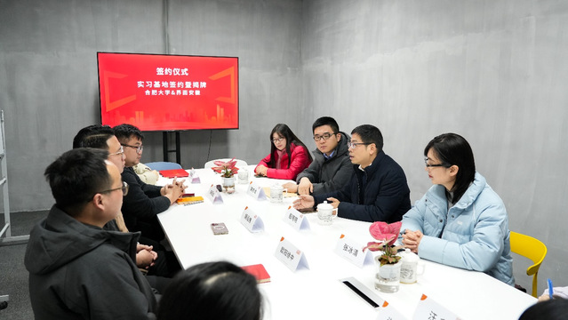座談會后,雙方共同簽署了《合肥大學語言文化與傳媒學院與界面安徽合作協議書》。文傳學院副院長殷明明代表校方、界面安徽總經理胡泓煒代表企方共同為“合肥大學實踐教學基地”揭牌。