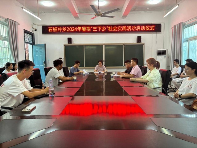 歷經兩個小時的車程,大家順利到達石板沖鄉初級中學后,在會議室召開語言文化與傳媒學院2024年暑期“三下鄉”社會實踐活動啟動儀式。儀式上,石板沖鄉副鄉長蘇越越與中小學校領導對語言文化與傳媒學院暑期三下鄉團隊的到來表示熱烈歡迎,緊接著向在場參會人員介紹了當地的特色景區和獨特風光,推薦大家可以前去采風,著重強調了對本次實踐活動的工作安排,提供優質文化供給,將“三下鄉”“鄉村振興”等工作有機結合,使“三下鄉”活動融入全面推進鄉村振興和農業農村現代化的偉大征程中,為加快建設現代化“富強美好”作出新的更大貢獻。