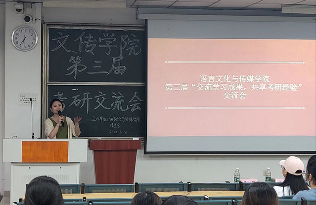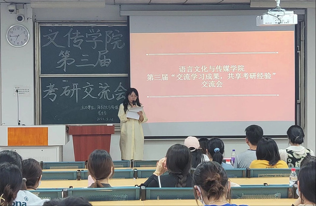 五月十六日晚六點半,語言文化與傳媒學院第三屆考研交流會在善思樓A座101教室順利舉辦。本次活動由六名考研上岸的學長學姐分享自己的經驗,為學弟學妹們提供參考和借鑒。語言文化與傳媒學院學工辦副主任顧盼盼老師、語言文化與傳媒學院崔璨老師,語言文化與傳媒學院學生會主席團成員作為嘉賓出席本次活動,文傳學院各年級同學參與其中。