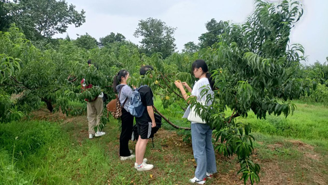 平安村水果種植基地占地210畝,多是山地地形。果園里的水果以桃子、西瓜、橘子、蘋果梨為主,今年在技術人員的建議下引進了特色品種—冬桃。在參觀過程中,隊員們近距離觀察了果園內的果樹,在工作隊的介紹下,對水果種植有了新的認識。