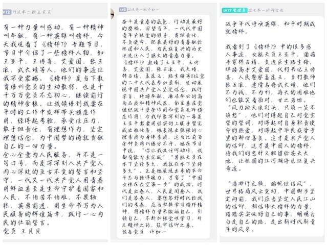觀看完《榜樣》節(jié)目后,學(xué)生黨員們都獲益匪淺,王貝貝同學(xué)說:“全心全意為人民服務(wù),并不是一句口號,而是深深刻入共產(chǎn)黨人內(nèi)心深處的亙古不變的誓言和堅守,一代又一代共產(chǎn)黨人用青春用鮮血甚至是生命守護著國家和人民,不怕苦不怕難,不畏犧牲,英勇前進,用生命書寫為人民服務(wù)的輝煌篇章,踐行一心為民的壯麗誓言。”許如一同學(xué)感慨道:“奮斗是青春的底色,行動是最好的磨礪。回望百年,一代代中國青年緊跟黨的領(lǐng)導(dǎo),勇?lián)熑危回撌姑炎蠲篮玫那啻韩I給祖國和人民,為民族復(fù)興的歷史洪流注入了強大的青春力量。時代是出卷人,人民是閱卷人,我們是答卷人,要想答好時代給我們的考卷,應(yīng)當積極學(xué)習(xí)榜樣精神,用榜樣力量來激勵自己,引領(lǐng)自己,不斷加強黨性學(xué)習(xí),補足精神之鈣、筑牢信仰之基。”鄭寶佳同學(xué)也說: “‘浩渺行無極,揚帆但信風’,世界格局風云變幻,中國腳步堅定向前,我們應(yīng)當堅定人民江山的信仰,相信偉大榜樣的力量,踏踏實實做好自己的事,明明白白走自己的路,走出新時代新青年的風采。”