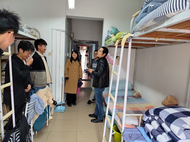 走訪過程中,丁增武院長對宿舍干凈整潔的環境表示了肯定和贊揚。他非常關心同學們在學校的學習情況,積極詢問同學們在生活和學習中遇到的困難,鼓勵同學們培養適合自己的學習習慣和方法,做好時間規劃,躬行實踐,將個人所學知識與社會發展需要緊密結合起來。他希望同學們保持樂觀向上的生活態度,在日常生活中多和學院同學交流,積極參與學院各類活動,建立和諧融洽的人際關系,共同營造良好的學習、生活環境。