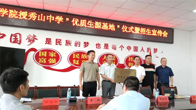 為全面加強招生宣傳工作,密切結合招生新形勢、新任務、新要求,深入推進優質生源基地建設,不斷提高生源質量,語言文化與傳媒學院副院長殷明明、教學辦主任章衡等一行于2023年6月16日赴懷寧開展優質基地建設,在懷寧縣秀山中學舉行了優質生源基地簽約授牌儀式暨招生宣傳會,并前往懷寧縣高河中學考察調研,學習汲取協同育人成功經驗,積極拓展優質生源基地建設。