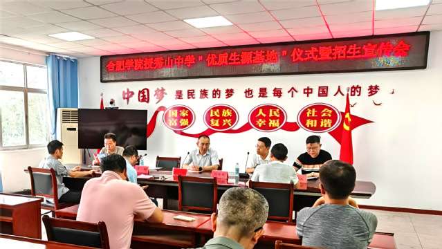 秀山中學坐落于安慶市獨秀山南麓,學校歷史悠久,薪火相傳迄今已近六十年。在優質生源基地簽約暨授牌儀式上,殷明明副院長與秀山中學校長程一文、副校長劉心喜、副校長葉小平等學校領導進行了深入交流。殷明明副院長介紹了合肥學院的辦學定位和語言文化與傳媒學院的專業特色,強調學院堅持立德樹人根本任務、堅持全員全過程全方位育人、堅持育人中心,他說學院本著協同育人、相互促進、共同發展的合作理念,積極構建優質生源基地長效合作機制,努力打造一流育人體系,培養一流人才方陣。程一文校長表示將通過優質生源基地建設實現兩校在合作育人各環節上協同發力、同頻共振,不斷深化校際合作,以全方位育人為出發點和落腳點,為合肥學院輸送更多高質量生源。